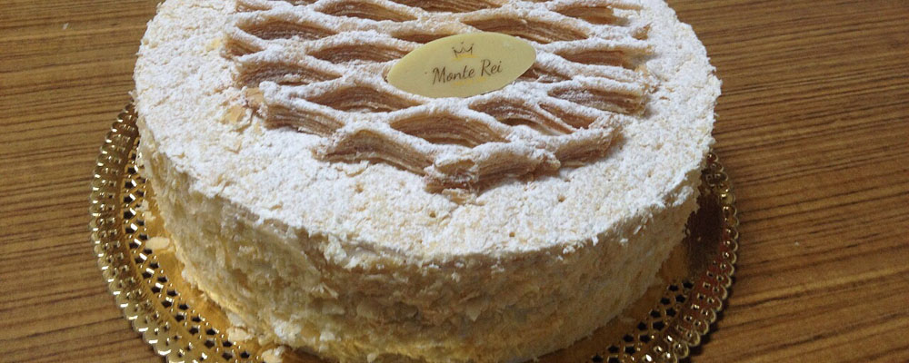 Ingredientes: massa folhada, recheada com Chantilly e creme de baunilha, cobertura de açúcar de confeiteiro.