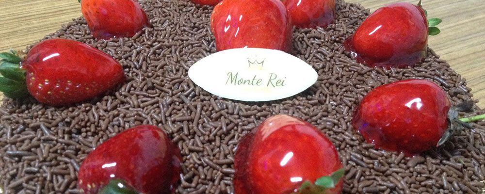 Ingredientes: pão-de-ló de chocolate, recheado com mousse de morango e morango picado, cobertura de mousse de morango e creme Paris**, decorado com morangos inteiros.