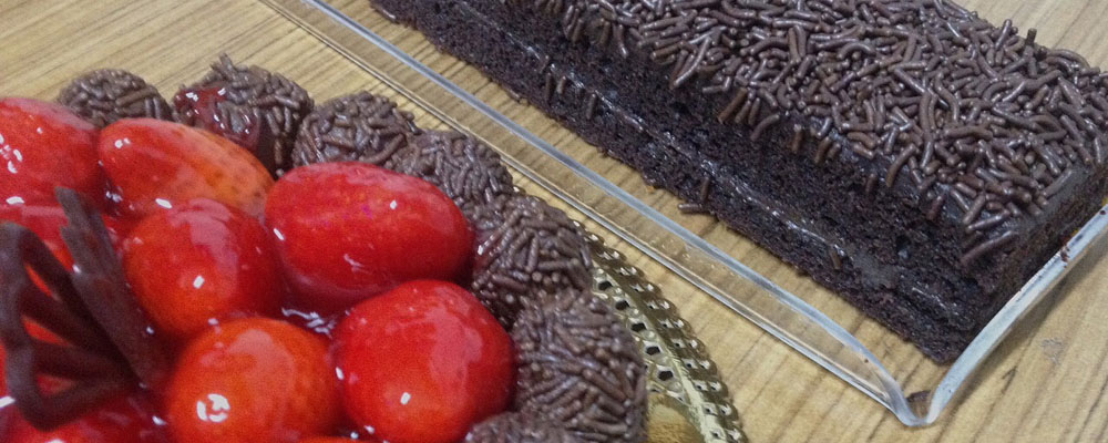 Ingredientes: pão-de-ló de chocolate, recheado com creme de brigadeiro, cobertura de creme de chocolate decorado com chocolate granulado e brigadeiros.